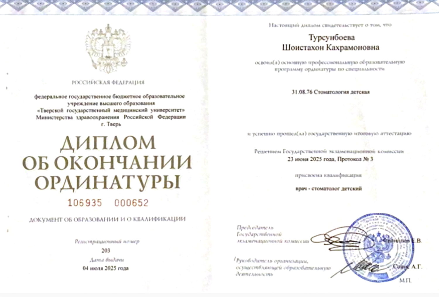 - 2025 г. Ординатура, Тверской государственный медицинский университет, стоматология детская.