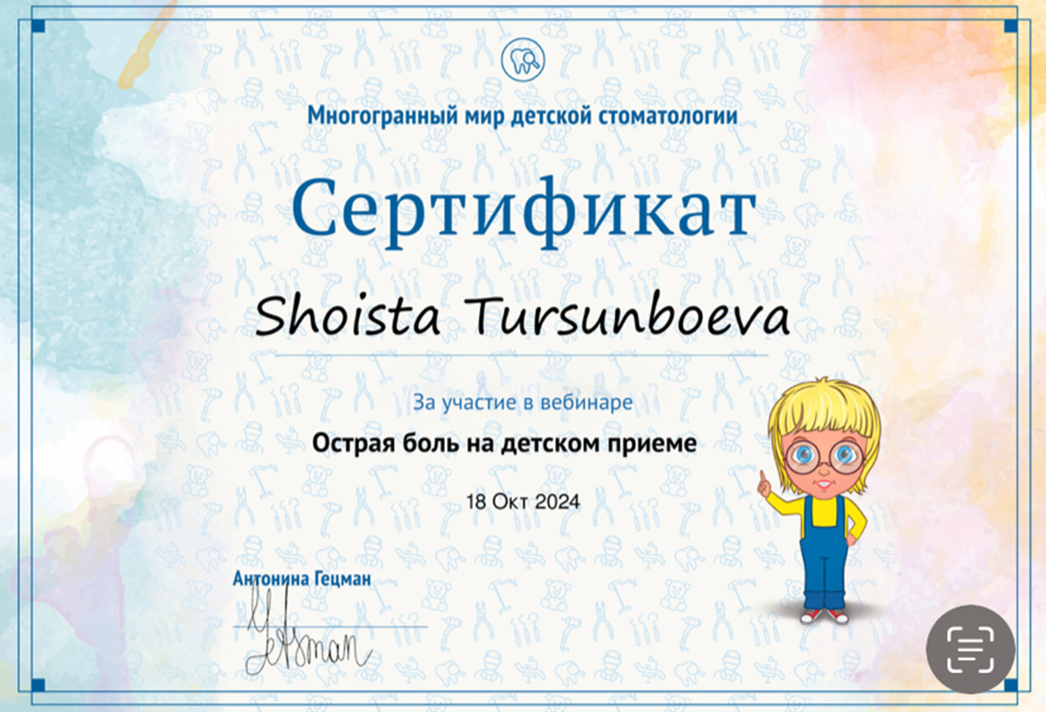 Шоиста Кахрамоновна специализируется на лечении кариеса молочных и постоянных зубов, пульпита, проведении профессиональной гигиены и восстановлении молочных зубов с применением коронок. Проводит лечение в условиях седации и наркоза, уделяет особое внимание адаптации ребенка к стоматологическому приему.