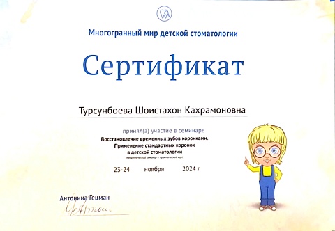 - 2024 г. «Восстановление временных зубов коронками. Применение стандартных коронок в детской стоматологии», Москва.