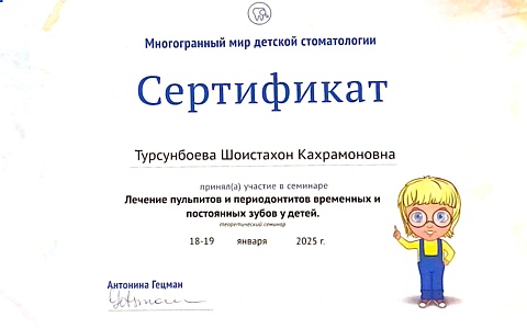 - 2025 г. «Лечение пульпитов и периодонтитов временных и постоянных зубов у детей», Москва.